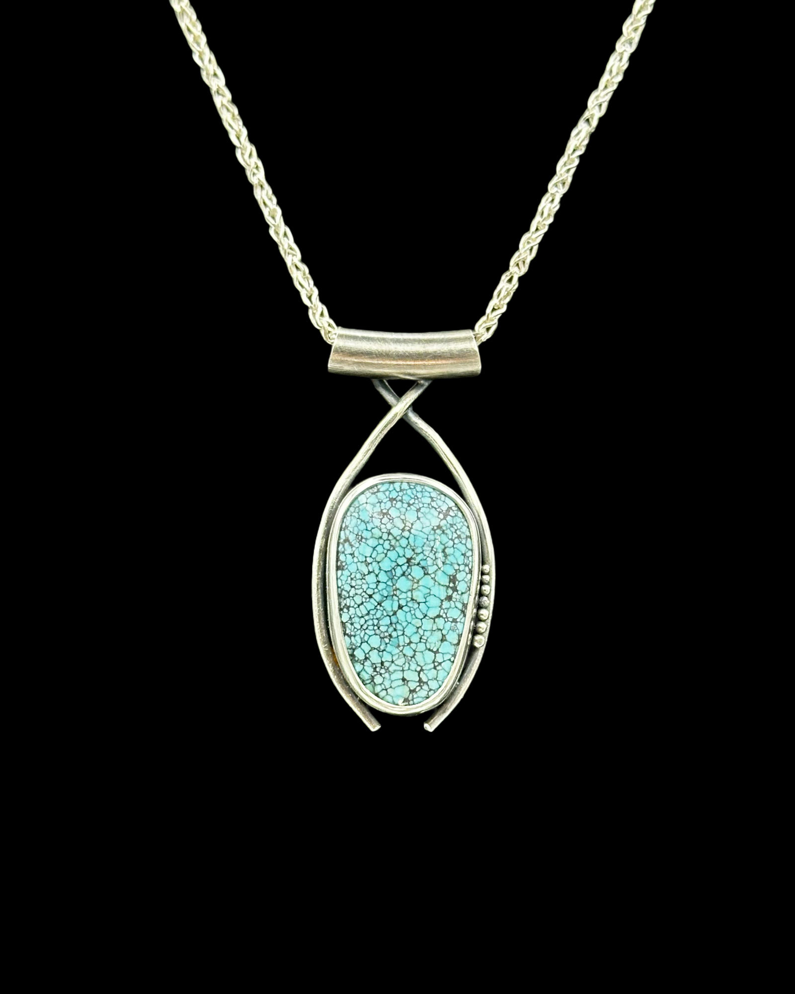 Magnificent Spiderweb Turquoise stone in a recycled Argentium Sterling Silver setting. The chain is Sterling Silver and cut to order. Pendant is about 1.5 inches high including bail.